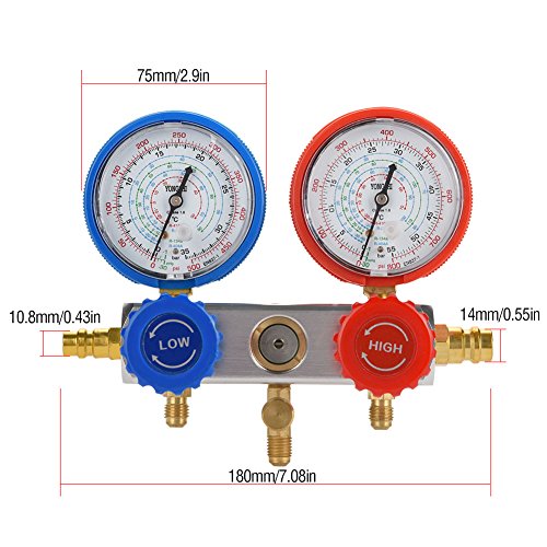 Eccellente tubo di carica del refrigerante: questo è un ottimo set di strumenti per test, carica ed evacuazione del refrigerante. Indicatore di pressione a molla speciale adottato, quadrante di precisione preciso, comodo per visualizzare i dati in qualsiasi momento, produzione professionale, sicura e affidabile, prestazione stabile.