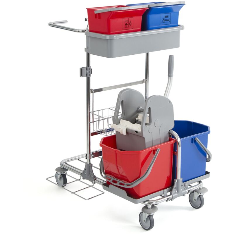 Carrello in metallo cromato, consigliato per una pulizia generale degli ambienti. E' provvisto di un portasacco da lt.120 per l'asportazione dei rifiuti, un cestino porta flaconi, una vaschetta in plastica in cui vengono posizionati due secchielli da lt. 6, di colore diverso per differenziare prodotti chimici e attrezzature varie di pulizia, uno strizzatore TEC, due secchi da 15 L per separare la soluzione con il detergente dall'acqua sporca, per una miglior pulizia ed una maggiore igiene, un attacco portamanico regolabile e griglia reggiscopa completano l'equipaggiamento del carrello. Consigliato per una pulizia completa di un ambiente con la prerogativa di utilizzare un carrello poco ingombrante. Sacco non in dotazione.