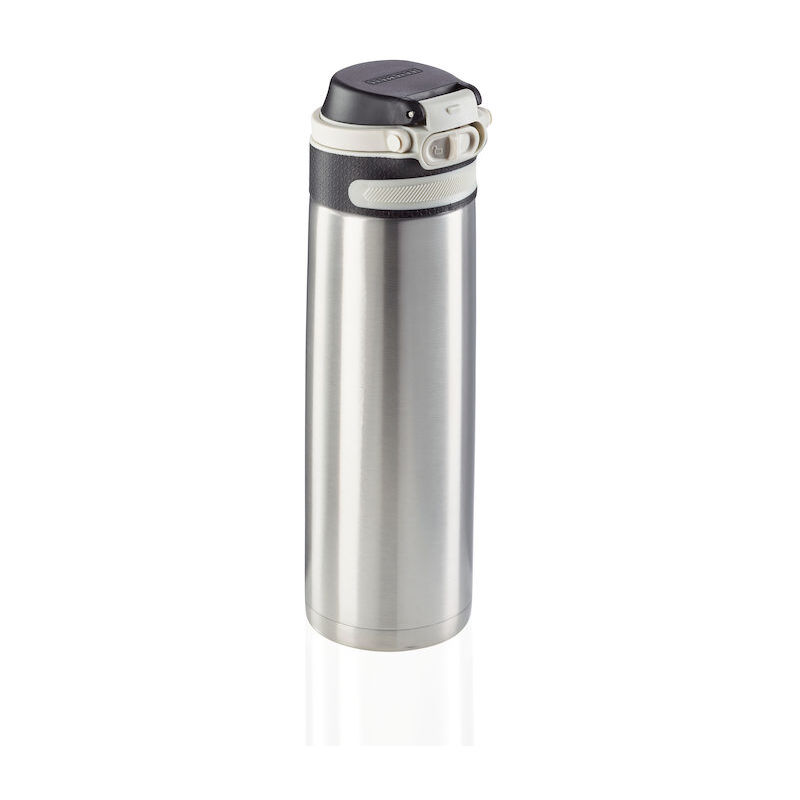 Leifheit 03272. Colore del prodotto: Argento, Materiale di rivestimento: Acciaio inossidabile, Materiale interno: Acciaio inossidabile. Volume: 600 ml Bevande gradevolmente calde e fredde con la borraccia termica Flip 600 ml argento La borraccia termica Flip 600 ml argento non solo è facilmente apribile con una sola mano grazie al Push-Botton sulla parte superiore, ma è anche ermetica al 100% e a prova di perdite. Inoltre, la borraccia è priva di BPA e di altre sostanze inquinanti! Perfetta per tutti coloro che non vogliono rinunciare al loro caffè o tè anche quando sono in viaggio: la borraccia termica Flip 600 ml di Leifheit. È ermetica al 100% e quindi ha una tenuta perfetta. Inoltre può essere aperta in tutta semplicità con una sola mano senza doverla appoggiare. Il pulsante per aprire il coperchio si aziona comodamente con l'indice. Un ulteriore sistema di blocco sul coperchio impedisce l'apertura involontaria: in questo modo la borraccia può essere portato con sé nella borsa