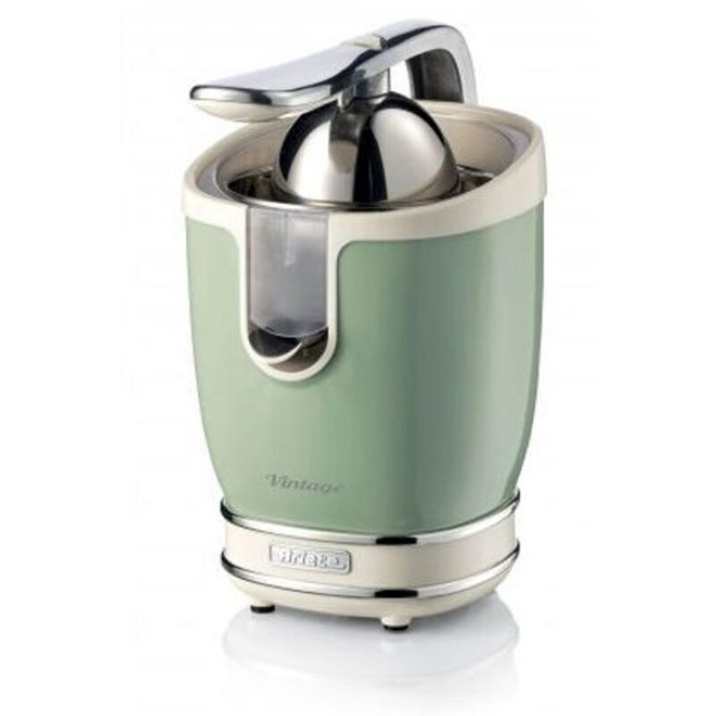 Potente, silenzioso e dal design inconfondibile: lo Spremiagrumi Elettrico Vintage arrederà la tua cucina con lo stile retrò e shabby chic tipico della Linea Vintage di Ariete, grazie al suo resistente corpo in metallo e alle sue preziose finiture cromate. In dotazione avrai a disposizione 2 coni per frutti grandi e piccoli: il cono grande in Acciaio Inox ideale per arance e pompelmi e il cono piccolo dotato di perno per bloccare comodamente anche i frutti più piccoli, come limoni e lime. Lo spremiagrumi professionale con leva a pressione schiaccia con facilità i frutti e ti assicura una spremitura professionale. Il beccuccio salvagoccia in Acciaio Inox evita sprechi di succo e ti garantisce una pulizia impeccabile delle superfici di appoggio. Una spremuta di arancia a colazione è perfetta per fare il pieno di Vitamina C, sali minerali ed energia! Doppio cono di rotazione Sì Interrutore On/Off Sì Funzione anti-gocciolamento Sì Materiali Metallo Materiale della scocca Metallo Quantità