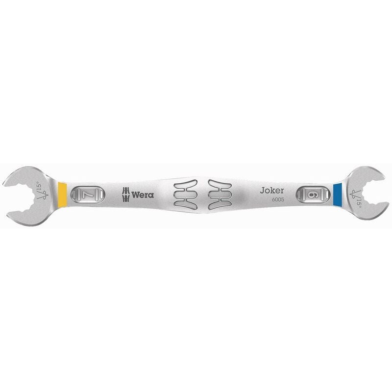 DATI TECNICI: Dimensioni: 6*7 mm CHIAVE JOKER DOPPIA APERTA Chiave Joker doppia 6*7MM Sviluppata appositamente per spazi ristretti La speciale geometria delle ganasce amplia la gamma di utilizzo dell'utensile Il piccolo angolo di lavoro consente di “afferrare” la vite ogni 15°. Con il sistema di ricerca utensili Wera “Take it easy”: sistema di codifica a colori per gli utensili in base alle dimensioni. La combinazione di una ganascia inclinata di 7,5° e una geometria a doppio esagono raddoppia il numero di punti di attacco. Con diverse rotazioni ripetute di 180° attorno all'asse longitudinale, è possibile posizionare la chiave sul dado o sulla testa della vite ogni 15°. La chiave Joker 6005 con la sua geometria delle ganasce ben studiata amplia notevolmente il campo di applicazione negli spazi più ristretti. Il Joker 6005 trova automaticamente il punto di applicazione appropriato dopo ogni giro. La superficie di alta qualità offre un'ottima e duratura protezione dalla corrosione**