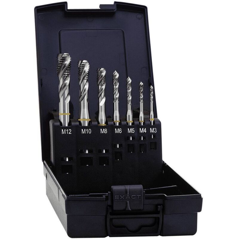 Dotazione: - 7x Punte per filettatura a macchina ( M3 / M4 / M5 / M6 / M8 / M10 / M12 ) - 1x Manuale di filettatura - 1x Valigetta per il trasporto Descrizione prodotto: L'assortimento per filettatura per macchine EXACT è adatto per tagliare filettature interne in fori passanti. Grazie al taglio a 5 velocità con taglio a spellatura, sono adatte al taglio di filettature interne metriche in fori passanti di dimensioni comprese tra M3 e M12. I maschi per macchine sono realizzati in acciaio HSS-E legato al cobalto di alta qualità, che presenta un'elevata qualità dell'utensile e garantisce quindi una lunga durata. Ciò significa che questi rubinetti sono adatti anche a materiali con una resistenza alla trazione superiore a 800 N/mm². Inoltre, è incluso un manuale di filettatura, dove è possibile documentarsi rapidamente sul tema del taglio del filo. Il set di rubinetti per macchina viene fornito in una valigetta di plastica di alta qualità in cui i rubinetti sono sempre ben ordinati e a