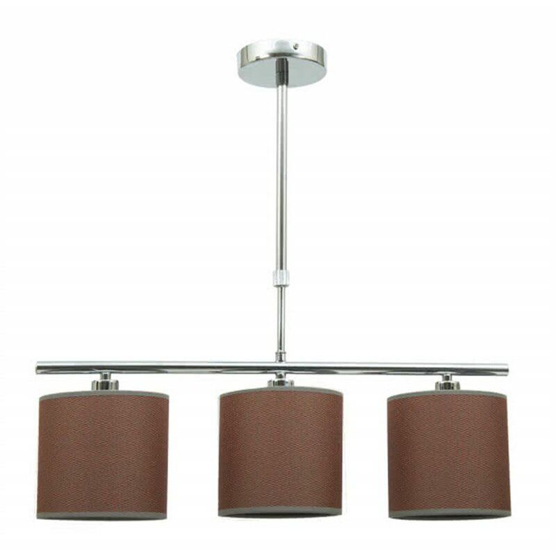 Lampada in stile moderno con tre paralumi diametro 14 centimetri, tessuto color caldaia e portalampada E14, struttura estensibile color cromo alta tra 50 e 70 centimetri con base a soffitto cilindrica e fissaggio tramite piastra metallica. il peso della lampada è di 950 grammi e le sue misure sono 50