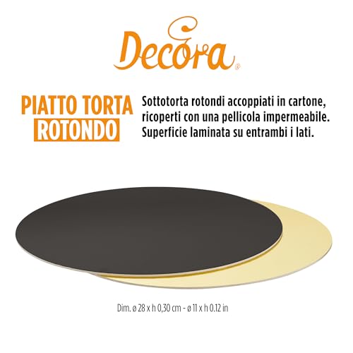 CONTENUTO - A casa Riceverai un Piatto Sottotorta Decora, in combinazione di colori oro e nero. I sottotorta Decora sono ideali per presentare e servire dolci mantenendo eleganza e stile. Il piatto sottotorta è realizzato in cartone di altissima qualità e rivestito in plastica. Ha uno spessore di soli 3 millimetri e un diametro di 28 cm.