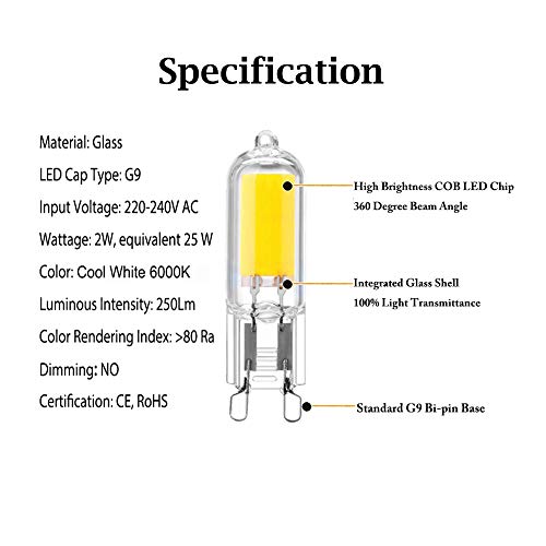 10-pack G9 2W Lampadine LED, Lampadine Alogene G9 da 25W, G9 2W COB LED Lampadine a Risparmio Energetico, Copertura in Vetro Trasparente, 6000K Bianco Freddo, 360 Grado, AC 220-240V, Non Dimmerabile