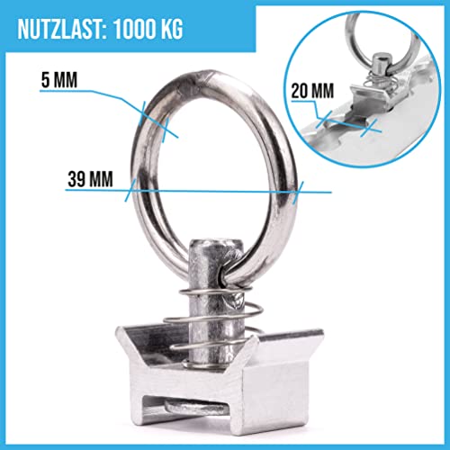 20 x 1000 kg Ganci singoli con occhiello per rotaia fresata anelli per il fissaggio per binario fermacarico airline