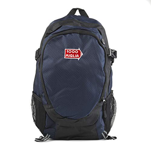 Zaino tecnico merchandising ufficiale 1000 MIGLIA colore blu e nero. Logo 1000 Miglia ricamato . Zaino in poliestere con tasca laterale porta borraccia, tasca frontale con zip e spallacci regolabili.