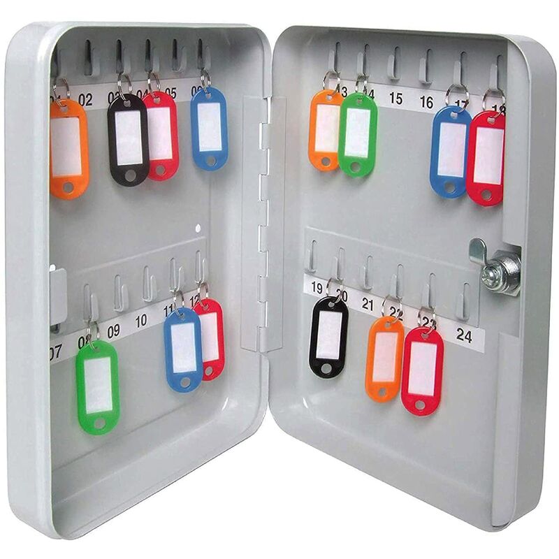 Questa cassetta di sicurezza con montaggio a parete per 24 chiavi realizzata in robusto acciaio con un'elegante finitura Silver e con serratura a cilindro è la scelta perfetta per la casa, la scuola, gli uffici o le agenzie immobiliari.