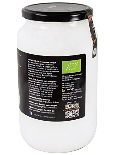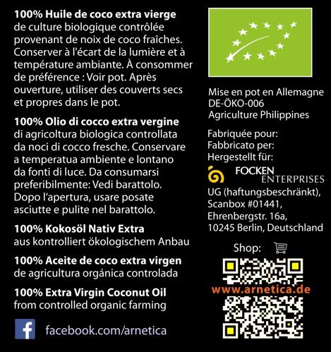 1000ml Olio di cocco extra vergine arnetica, 1L, biologico, puro, nativo, spremuto a freddo, alta qualità, non processato, vegano