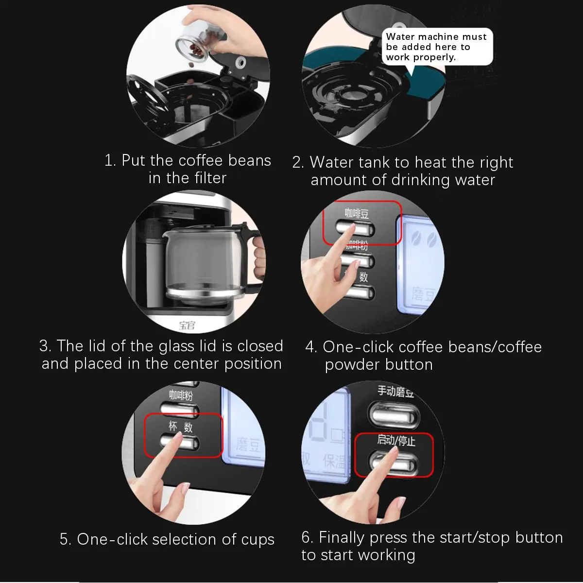 1000W Electric Coffee Maker Machine Fully-Automatic Drip Coffee Maker Tea Coffee Pot Barista Home Kitchen Appliance 1200ml 220V