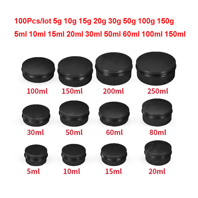5g-250g di Alluminio del Metallo scatole Rotonde di Latta Scatola Nera Vuoto Crema Cosmetica Jar Pot Caso di Filetto di Vite coperchio Contenitore Balsamo per le labbra Descrizione: Materiale: Alluminio Colore: Nero Realizzato in materiale di alluminio di alta qualità. Non è facile da rompere. Senza soluzione di continuità di chiusura del coperchio senza perdite per un comodo trasporto di liquido cosmetico. Perfetto per la memorizzazione di mineralizzata trucco, ombretti, lozioni, balsami per labbra, toner, creme, unguenti, polvere acrilica, e altri aiuti di bellezza. Leggero che è un portatile formati per i viaggi, viaggio, il campeggio, ecc.