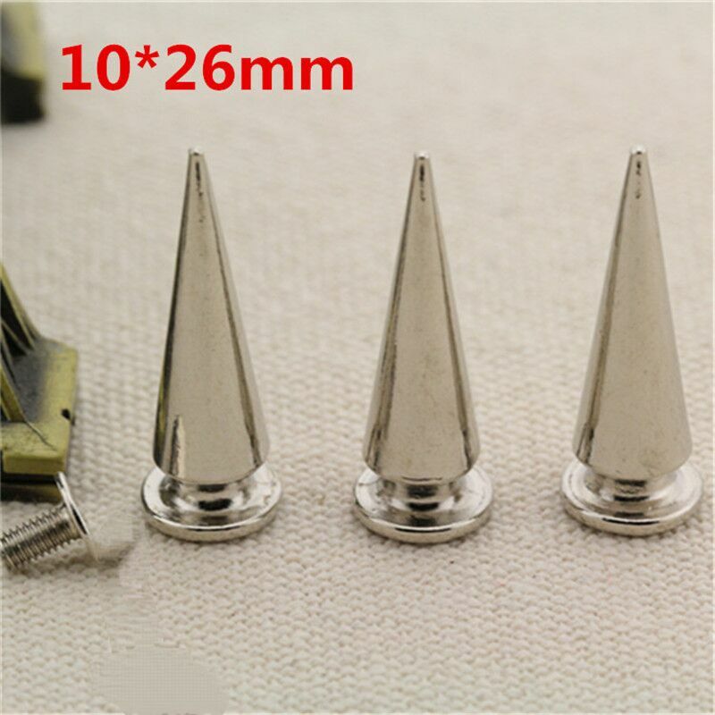 100 punte a cono fai da te sono avvitate insieme. Dimensioni: circa 10 mm (diametro) * 26 mm (altezza) Materiale: lega Adatto per i bagagli, scarpe, cappelli, pantaloni, giacche, collari per cani, cinture, bracciali in pelle, borse, ecc. Installazione semplice: ideale per indumenti decorativi, ecc. Può essere facilmente fissato con viti.