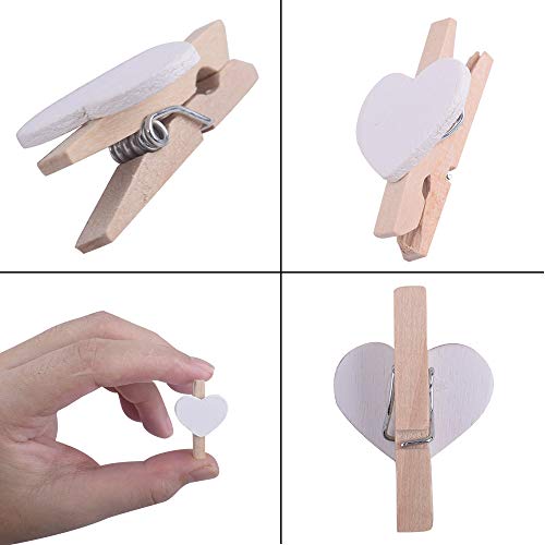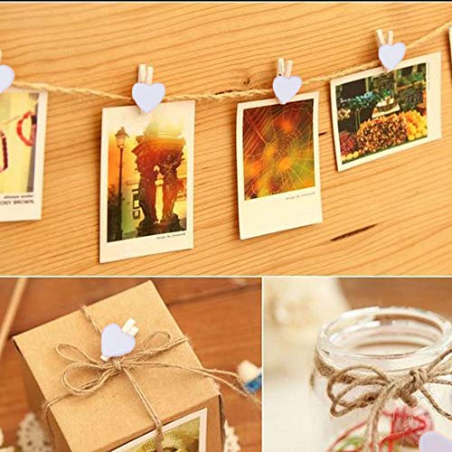 100pz Mollette in Legno a Forma di Cuore Bianco + 100 metri Filo Juta Naturale per Foto Mostra Fotografica Fai Da Te Sacchetto Regalo