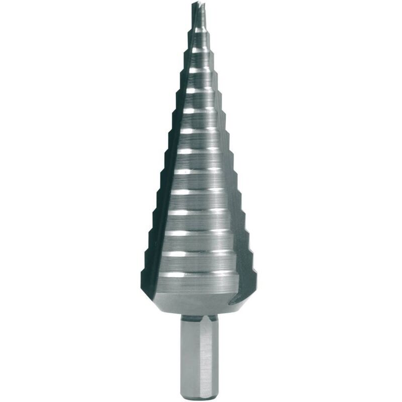 CBN-Levigato · con 3 taglienti · Angolo di picco 118 ° · Angolo passo 90° · Albero con 3 superfici di bloccaggio Le scanalature di bloccaggio profondamente a terra per trapani a gradini con 3 taglienti assicurano un lavoro assolutamente privo di sonagli. A causa del basso carico di taglio, è possibile una maggiore velocità di avanzamento, soprattutto per materiali morbidi come i metalli non ferrosi. Il cono facilita la retrazione dei fogli forati. Altre caratteristiche tecniche: · Angolo di picco: 118° · Angolo passo: 90° · Scanalatura: raddrizzare · Ø: 4/ 6/ 8/ 10/ 12/ 14/ 16/ 18/ 20/ 22/ 24/ 26/ 28/ 30mm · Numero di talee: 3 · Materiale da taglio: HSS