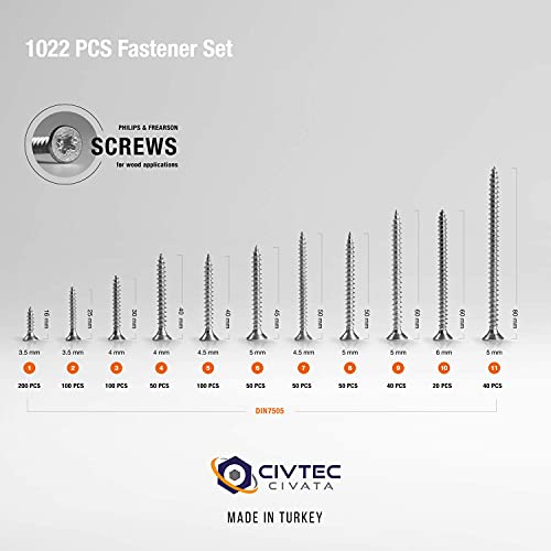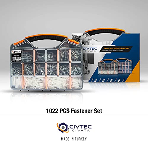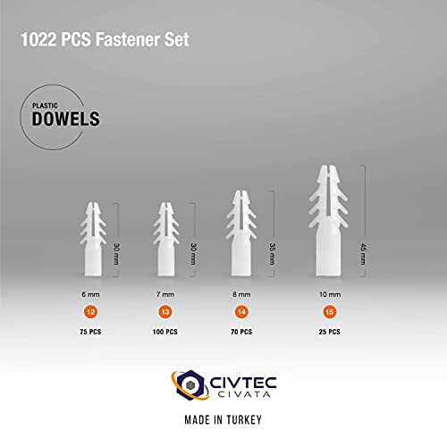 Set di 1022 tasselli per viti - M3.5, M4, M5 + M6, M7, M8, M10 tasselli + punta Pozidriv, set di tasselli per l'uso in diversi settori - Kit di assortimento - viti per legno DIN 7505