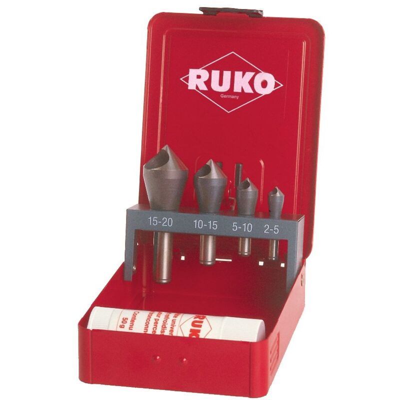 Custodia in plastica con coperchio pieghevole. Composizione: 4 pezzi. Utensili svasatori-sbavatori Ø 2/5 - 5/10 - 10/15 - 15/20 + spray da taglio 50 ml.