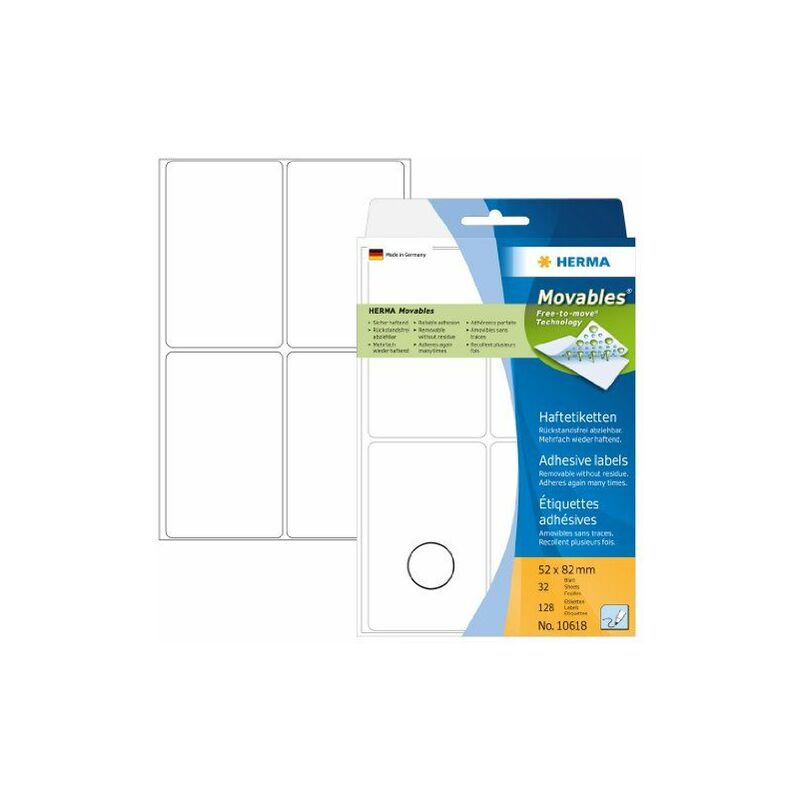 HERMA 10618. Colore del prodotto: Bianco, Forma: Rettangolo con angoli arrotondati, Materiali: Carta. Larghezza: 52 mm, Altezza: 82 mm. Etichette da pacchi: 128 pezzo(i), Fogli per pacco: 32 fogli