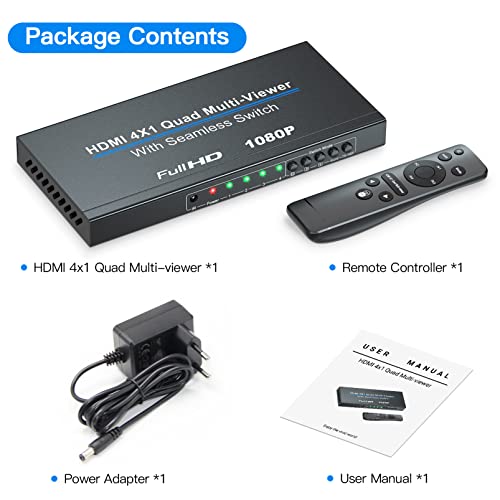 【4x1 HDMI Quad Multiviewer】 Il multiviewer HDMI a quattro ingressi e un'uscita consente agli utenti di visualizzare quattro sorgenti HDMI su uno schermo HDMI in modalità di visualizzazione multipla. Risoluzioni massime di input e output fino a 1080P a 60 Hz. Nota: il telecomando non contiene batterie, acquistalo tu stesso.