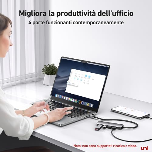 [Hub USB C a 4 porte] Questo HUB USB C a USB è in grado di estendere una porta USB-C a 4 porte USB 3.2. È possibile collegare facilmente mouse, tastiera, fotocamera, flash USB, dischi rigidi, stampante, lettore di schede e altri dispositivi USB.