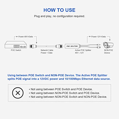 【Widely Application】Poe splitter eliminates the need for a power supply or for a camera to be located near a power outlet. Available with IP camera, IP phone, wireless AP and other 12V Non-POE devices for home, school, office, park, factory, mall, warehouse, etc