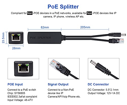 【High Performance】poe splitter 12v power over Ethernet Splitter splits a PoE network cable from a PoE switch into a separate power and Gigabit Ethernet source, this is ideal for devices that don't support PoE in a PoE environment