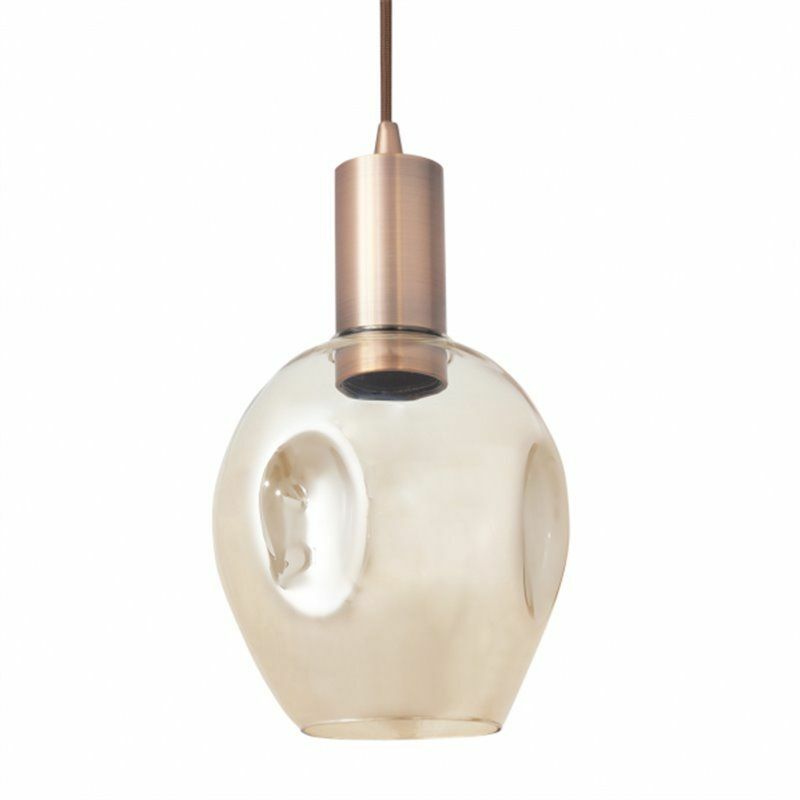 Sospensione serie METEORO di colore ambra. In vetro con tre fori. La sua altezza è regolabile e il suo diametro è di 14 cm. Portalampada E27.