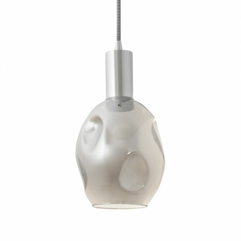 Sospensione serie METEORO in colore cromo/fumé. In vetro con cinque fori. La sua altezza è regolabile e il suo diametro è di 16 cm. Portalampada E27.