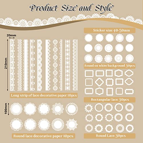 Set di Adesivi Vintage: Riceverete 90 fogli di adesivi decorativi in pizzo trasparente, 10 fogli di carta decorativa in pizzo lunga 210*20 mm e carta decorativa in pizzo rotonda cava 100*100 mm. Diversi pizzi in stile vintage per soddisfare le esigenze dello scrapbooking fai da te.