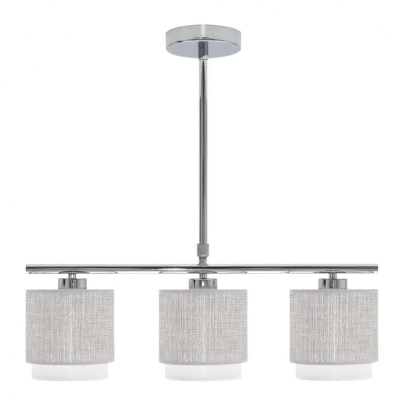 Lampada della serie Kenya in grigio/bianco. Ha un portalampada con tre luci E14. La sua altezza è regolabile. Puoi completare la famiglia con il piano del tavolo e il pavimento del soggiorno (bianco/grigio e grigio/bianco).