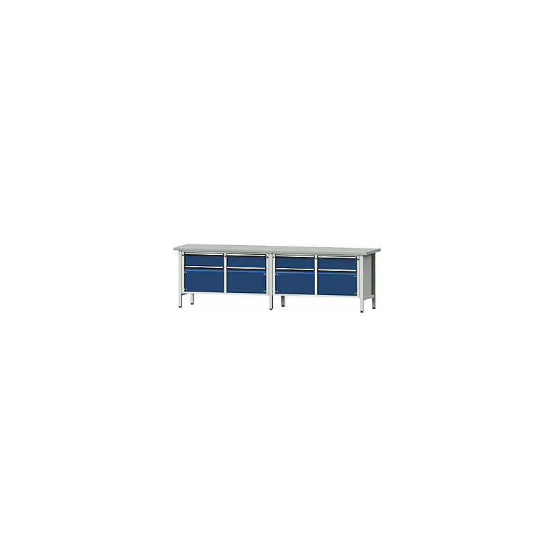 Banco da lavoro con larghezza 2800 mm, struttura modulare, 4 ante, 4 cassetti, piano rivestito in lamiera d'acciaio. Fornitura = montato. Larghezza piano = 2800 mm. Profondità piano = 700 mm. Tipo di piano = rivestimento in lamiera d'acciaio, zincata. Spessore piano = 40 mm. Numero cassetti = 4 pz. Altezza cassetti = 4x180 mm. Altezza = 840 mm. Altezza di lavoro = 840 mm. Colore corpo = grigio chiaro RAL 7035. Colore frontalino = blu genziana RAL 5010. Versione cassetti = guida a rulli. Portata per cassetto = 100 kg. Estrazione cassetti = 86%. Materiale telaio = acciaio, verniciato a polvere. Numero ante = 4 pz. Altezza porta = 4x360 mm. Portata statica = 1500 kg. Versione telaio = tubo a sezione quadra 45x45 mm. Serratura = chiusura centralizzata a cilindro con nucleo sostituibile. Cassetti con estrazione parziale (ca. 86 %). Ingombro ridotto, impiegabili come postazione di lavoro doppia. Massima stabilità - componenti del corpo ribattuti fino a 10 volte. Piani di lavoro di qualità a