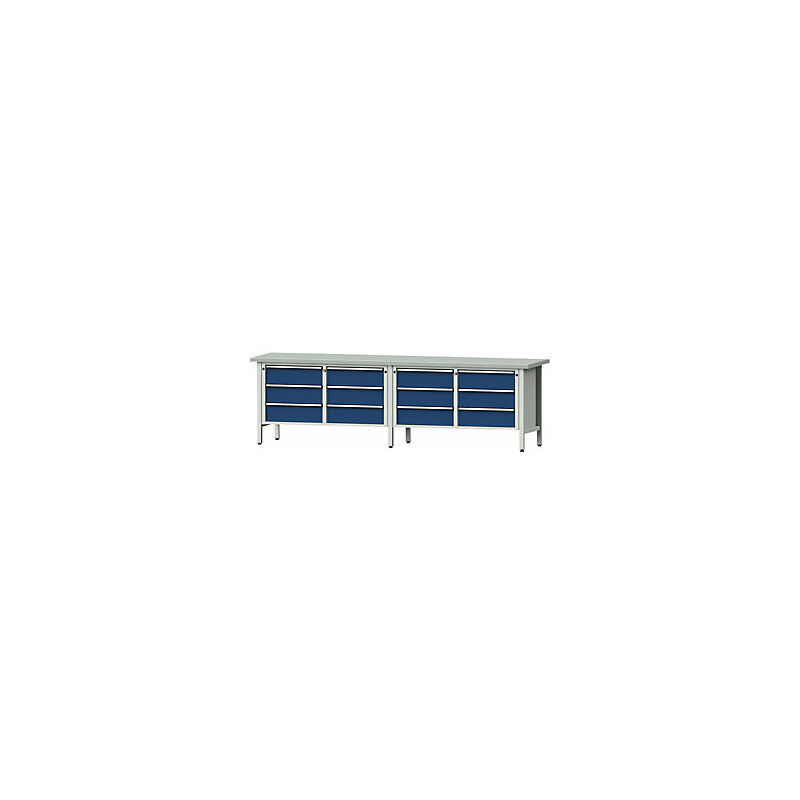 Banco da lavoro con larghezza 2800 mm, struttura modulare, 12 cassetti, 180 mm con estrazione totale, piano rivestito in lamiera d'acciaio. Fornitura = montato. Larghezza piano = 2800 mm. Profondità piano = 700 mm. Tipo di piano = rivestimento in lamiera d'acciaio, zincata. Spessore piano = 40 mm. Numero cassetti = 12 pz. Altezza cassetti = 12x180 mm. Altezza = 840 mm. Altezza di lavoro = 840 mm. Colore corpo = grigio chiaro RAL 7035. Colore frontalino = blu genziana RAL 5010. Versione cassetti = guida a rulli. Portata per cassetto = 100 kg. Estrazione cassetti = 100%. Materiale telaio = acciaio, verniciato a polvere. Portata statica = 1500 kg. Versione telaio = tubo a sezione quadra 45x45 mm. Serratura = chiusura centralizzata a cilindro con nucleo sostituibile. Cassetti con estrazione totale (100%). Ingombro ridotto, impiegabili come postazione di lavoro doppia. Massima stabilità - componenti del corpo ribattuti fino a 10 volte. Piani di lavoro di qualità a scelta in legno massello