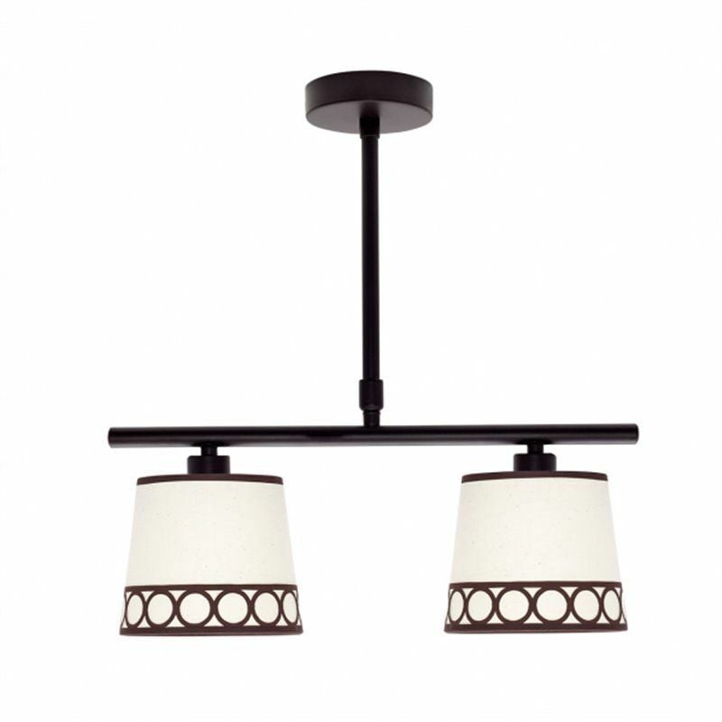 Lampada a due luci serie Dalia di colore beige/marrone. È realizzato in metallo e materiale tessile, con bordo decorativo con motivi circolari. La famiglia può essere completata con la lampada a sospensione, da terra, da tavolo e a tre luci. Ha due portalampade E14.