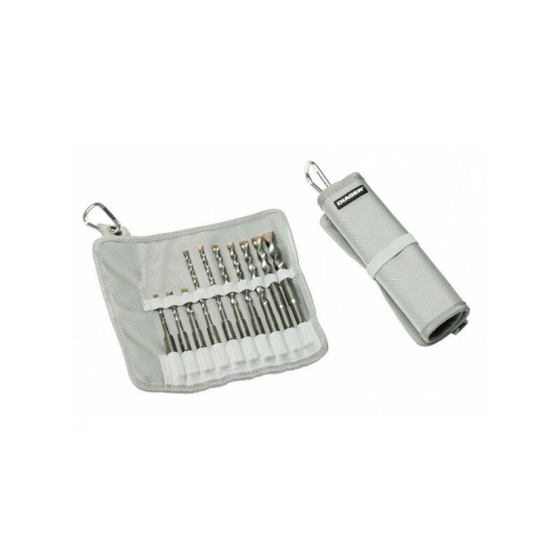 Dettagli: Trapani a percussione Inserto autocentrante con angolo di 160° Effetto scalpellatura per lo scoppio del calcestruzzo Evacuazione accelerata della polvere mediante uno scivolo di compressione seguito da una camera di aspirazione - Set di 10 trapani per calcestruzzo TWISTER-PLUS = diametri 5, 6 e 8 mm, lunghezza 110 mm Diametri 6 (x2), 8 (x2), 10, 12 e 14 mm, lunghezza 160 mm - Set di 5 frese per calcestruzzo TWISTER-PLUS = Diametri 6 e 8 mm, lunghezza 110 mm Diametri 6, 8 e 10 mm, lunghezza 160 mm Caratteristiche