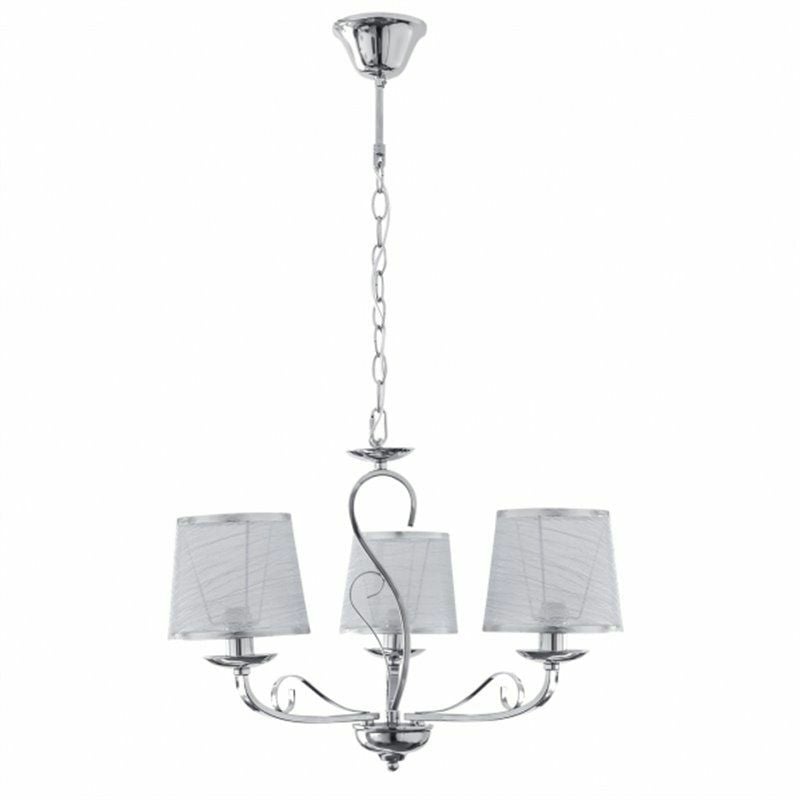 Lampada a tre luci serie Sumba color cromo. Ha una struttura in metallo e un paralume in tessuto con riflessi argento e finiture argento. Questo presenta un tessuto traslucido che lascia passare la luce creando un gioco di luci molto interessante. Le sue dimensioni sono 60 & lt, 85x49x49 cm (altezza regolabile). Il portalampada è E14. Il piano da tavolo, l'applique e la lampada a cinque luci sono disponibili anche nei colori cromo e pelle.