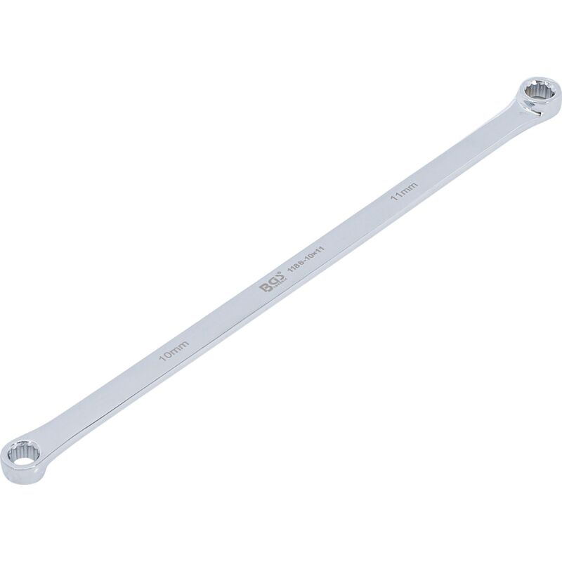 Forgiato a freddo Cromato lucido Impronta lato anello: Dodici punti. Extra Lungo Apertura chiave 1: 10 mm Apertura chiave 2: 11 mm Lunghezza: 290 mm