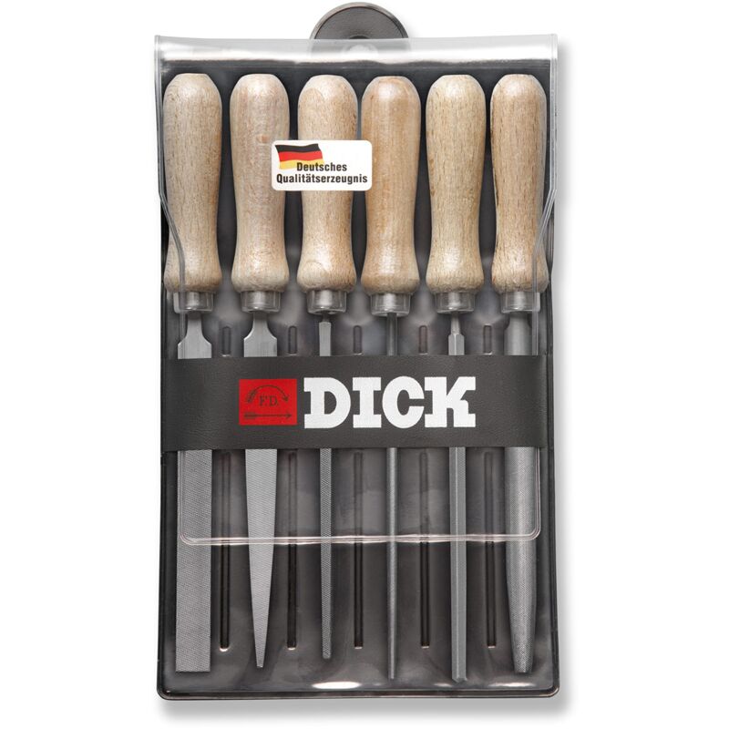 Friedr. Dick set di lime per chiavi 6 pz. 100mm - 11861020 6 pezzi Lunghezza del taglio: 100mm manico di legno ergonomico particolarmente indicato per acciaio, ferro e metalli non ferrosi Il set di lule per chiavi DICK taglio 2 con lunghezza del taglio di 100mm è una alternativa economica particolarmente indicato per lavori di limatura generici e grossolani. Particolarmente raccomandata la lima per acciaio, ferro e materiali non ferrosi per lavori nell'industria, artigianato e hobbistica. Il set è composto da rispettivamente una lima piatta, piatta a punta, triangolare, quadra, mezza tonda e tonda. . Il manico unisce ergonomia e design. Le superfici di contatto arrotondate e l'appoggio per il pollice più ampio, garantiscono una presa ottimale e impediscono di scivolare quando si lavora a spinta e a trazione. Il set è inserito in una busta neutrale. Contenuto della confezione 1x Set di lime per chiavi Dick - Traditionsmarke der Profis La nostra impresa familiare è tra i più importanti