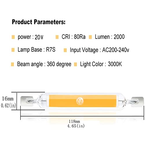 [LDFHOIN Lampadina LED R7S Dimmerabile]: 20w 118mm doppio attacco R7s Base, Lampadina a LED ad alta luce R7S 118mm dimmerabile, doppio fine COB LED 2000LM, bianco caldo 2700K 360 gradi angolo di diffusione della luce, basso calore supporto lampada in ceramica, struttura di connessione a prova di esplosione, chip COB LED di alta qualità.