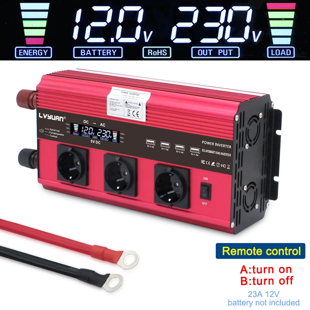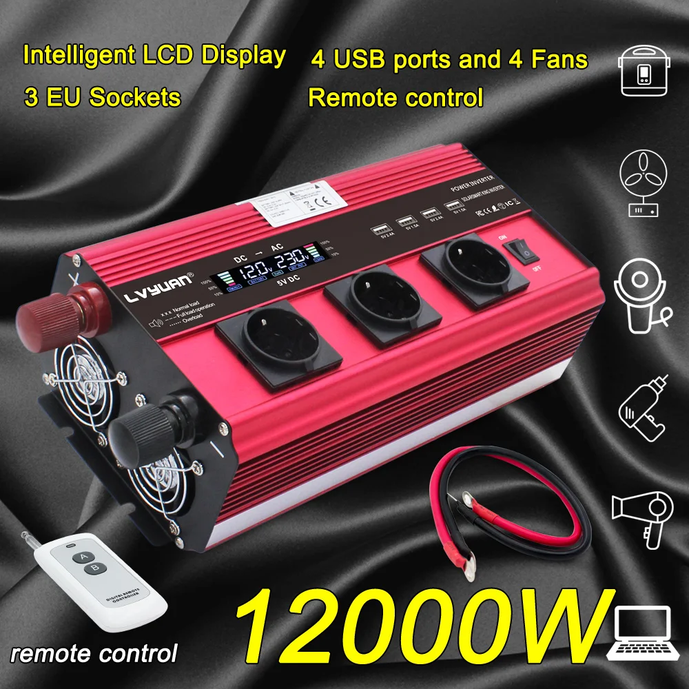 12000W EU socket LCD Transformer adapter charger converter power inverter DC12V/24V to AC 230V with 4Fan 4usb remote control Red