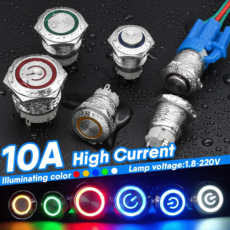 12/16/19/22mm Metal Push Button Switch Power Button Waterproof Flat Circular Button LED Light Self-lock Button 5v 12v 24v 220v