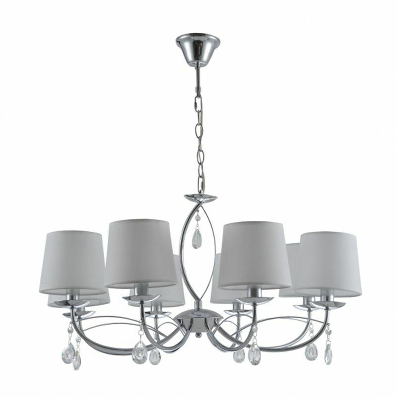 Lampada della serie Monterrey a otto luci in colore cromo. È realizzato in metallo, vetro e materiale tessile bianco. Ha un corpo a forma di occhiello da cui pende un piccolo ciondolo di cristallo, come in ciascuno dei suoi bracci. Le sue dimensioni sono 65 & lt, 90x19x67x67 cm (altezza regolabile). È disponibile anche in pelle beige/colore sfumato. La famiglia si completa con il piano da tavolo, la lampada da terra e la lampada a cinque e tre luci. Il portalampada è E14.