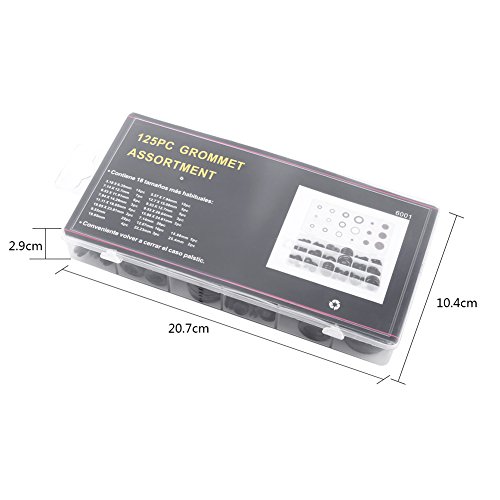 CON CUSTODIA: Questi occhielli elettrici in gomma sono forniti in una pratica custodia e assortiti in diverse dimensioni. Con tabella indice per una facile selezione.