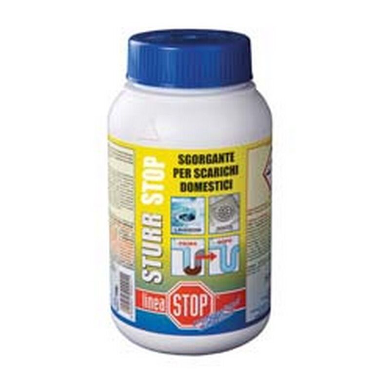Disotturante chimico altamente concentrato che in pochi minuti rende liquidi i materiali, sia organici che non, che ostruiscono il defluire dei liquidi negli scarichi - si utilizza versando da un terzo a metà di sturr stop nello scarico, in funzione delle