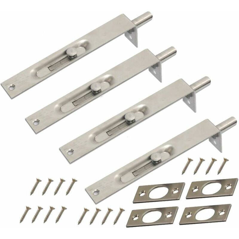 Confezione da 4 bulloni da 6, dimensioni 15 cm x 2,2 cm (larghezza) x 3,5 cm (profondità). Realizzato in acciaio inossidabile 304, finitura spazzolata, affidabile e sostenibile. Progettato per portefinestre doppie. Il chiavistello può essere installato verso il basso o verso l'alto. Questo chiavistello incassato viene solitamente installato sul bordo superiore e inferiore della porta secondaria nelle portefinestre e doppie installazioni di porte;