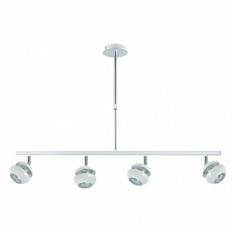 Sospensione con quattro faretti della serie BEETHOVEN in colore BIANCO/ARGENTO. Realizzato in metallo con quattro portalampada GU10. Lampadine non incluse. Design moderno e originale con faretti tondi e articolati verticalmente, con una rotazione orizzontale di quasi 360°, permettendo così di orientare i punti luce verso qualsiasi zona della stanza. Le sue dimensioni sono regolabili in altezza da 44 & lt, 68X80X12 centimetri. Modello disponibile anche in nero/oro. La collezione può essere completata con la versione a sospensione a tre luci, striscia a quattro luci, striscia a tre luci, striscia a due luci, plafoniera a tre luci e lampadina a una luce.