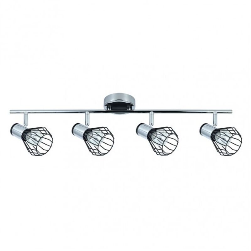 Quattro faretti della serie MATEO in colore CROMO/NERO. Realizzato in metallo con quattro portalampada E14. Lampadine non incluse. Dal design moderno e originale con faretti articolati verticalmente e una rotazione orizzontale di quasi 360°, permettendo così di orientare i punti luce verso qualsiasi zona della stanza. Le sue dimensioni sono 15X69,5X8,5 centimetri. Modello disponibile anche nel colore cromo/nichel e in versione strip a due luci, faretto a una luce e plafoniera a tre luci.