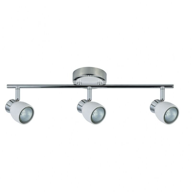 Striscia con tre faretti della serie CHACHO in colore BIANCO/CROMO. Realizzato in metallo con tre portalampada GU10. Lampadine non incluse. Dal design moderno e originale con faretti articolati verticalmente e una rotazione orizzontale di quasi 360°, permettendo così di orientare i punti luce verso qualsiasi zona della stanza. Le sue dimensioni sono 14X48.5X10 centimetri. Modello disponibile anche in pelle e colore nichel/cromo. La collezione può essere completata con la versione striscia a quattro luci, striscia a due luci, plafone a tre luci e una lampadina.