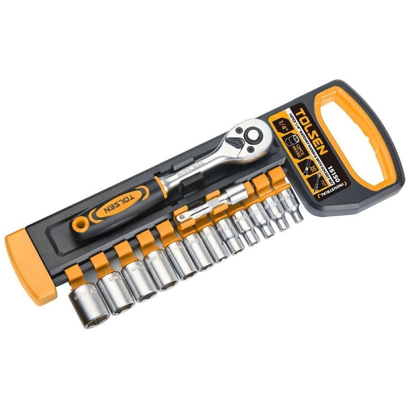 14 pezzi contiene: 12 prese metriche Cr-V: 4,5,5,5,6,7,8,9,10,11,12,13,14 mm 1 barra di estensione: 50 mm 1 maniglia a cricchetto bicomponente, 72T, sgancio rapido