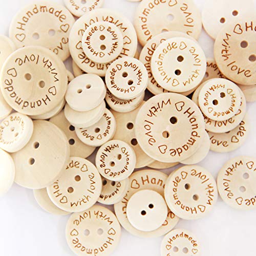 150pcs Pinowu bottoni da cucito in legno fatti a mano con amore, rotondi, 2 fori, 15 - 20 - 25 mm