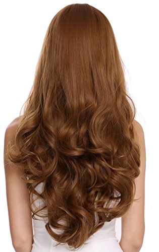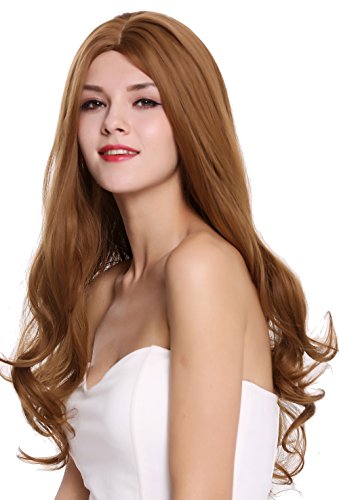 Meravigliosa parrucca da donna con splendida riga in mezzo. I lunghi capelli scendono lisci per poi diventare ondulati. Il colore è un caldo biondo ramato, leggermente rossiccio.