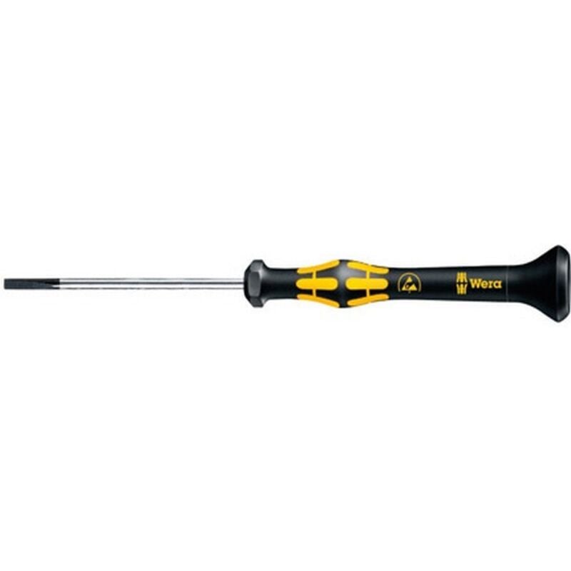 Dettagli tecnici Ambito di applicazione (cacciavite) ESD Cacciaviti caratteristiche Impugnatura multicomponente Dimensione del prodotto, lunghezza 177 mm Forza Taglio Larghezza della lama 4 mm Lunghezza della lama 80 mm Materiale Acciaio per utensili Proprietà del materiale legato Tipo prodotto Cacciavite a taglio 1578 A ESD 0,80 x 4,0 x 80 mm Micro Micro cacciavite Wera protetto elettrostaticamente. Protezione sicura contro l'energia elettrostatica e danni associati. Sostenendo la mano sul cappuccio rotante e la zona di rotazione rapida sotto il cappuccio rotante è possibile eseguire un avvitamento veloce e fulmineo. Non è più necessario tanto tempo. Zone di presa con inserti morbidi integrati per trasmettere forze di avvitamento e svitamento più elevate. Zona di precisione per l'angolo di rotazione corretto durante i lavori di regolazione. Punti di forza e dettagli Cacciavite Micro per viti a taglio Utensile protetto dall'elettricità statica grazie alla sua resistenza superficiale